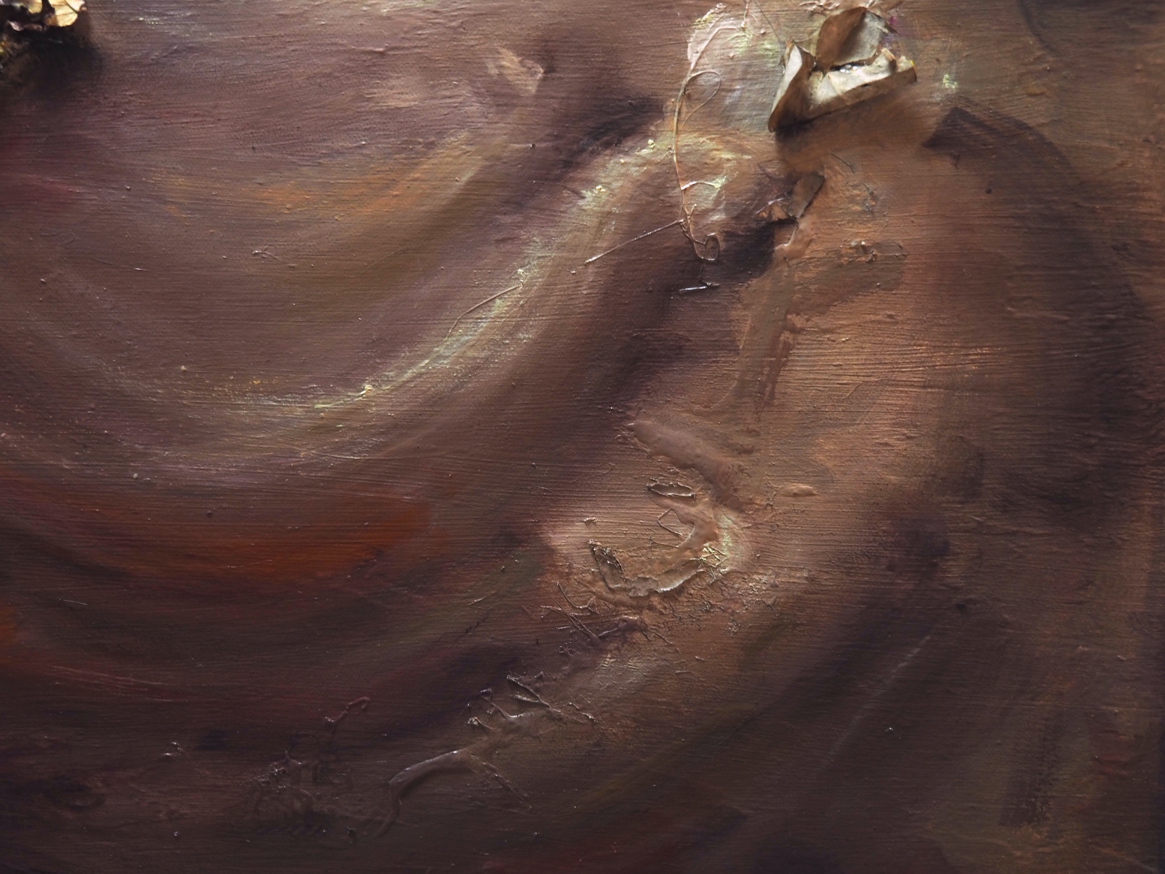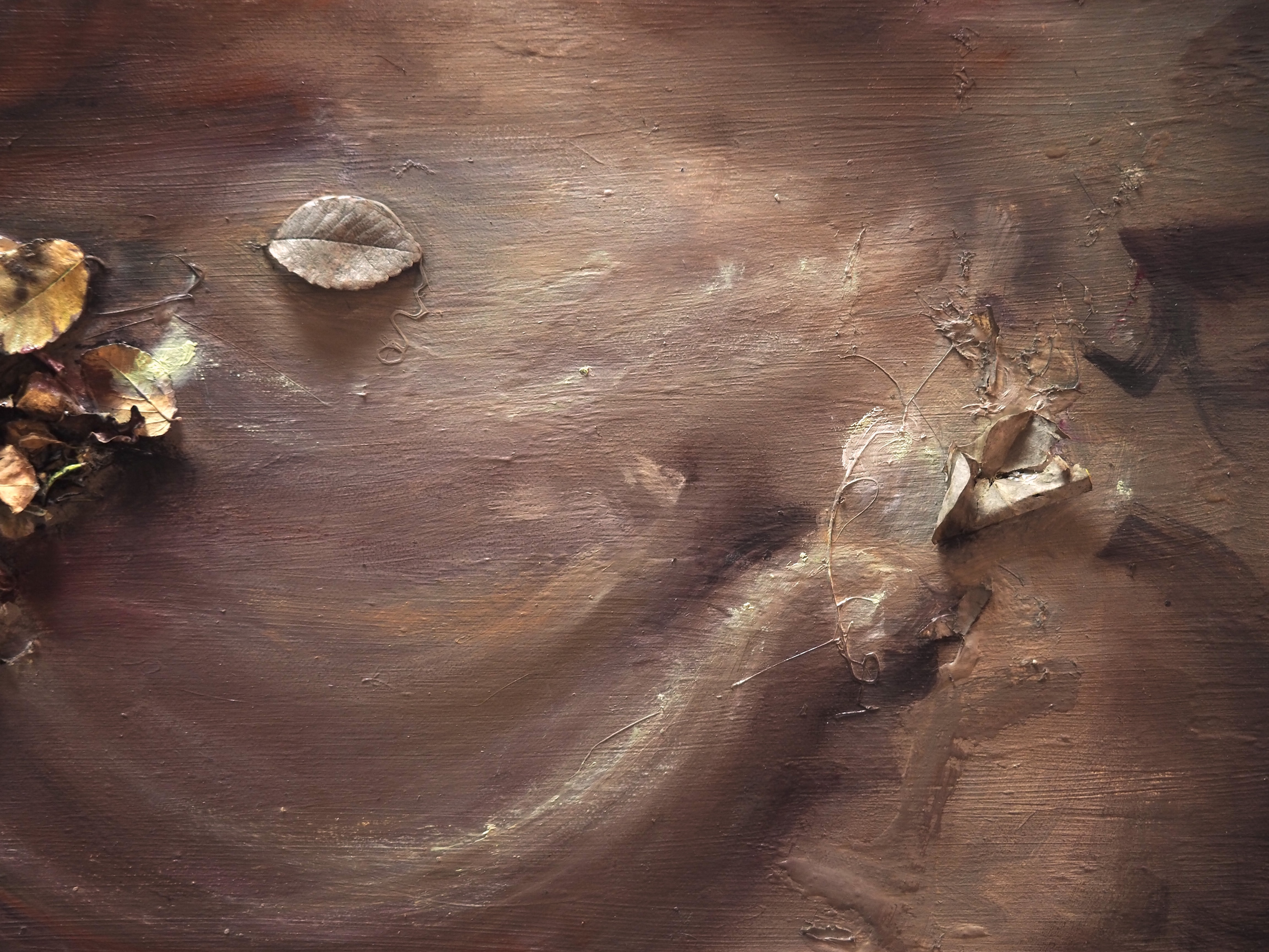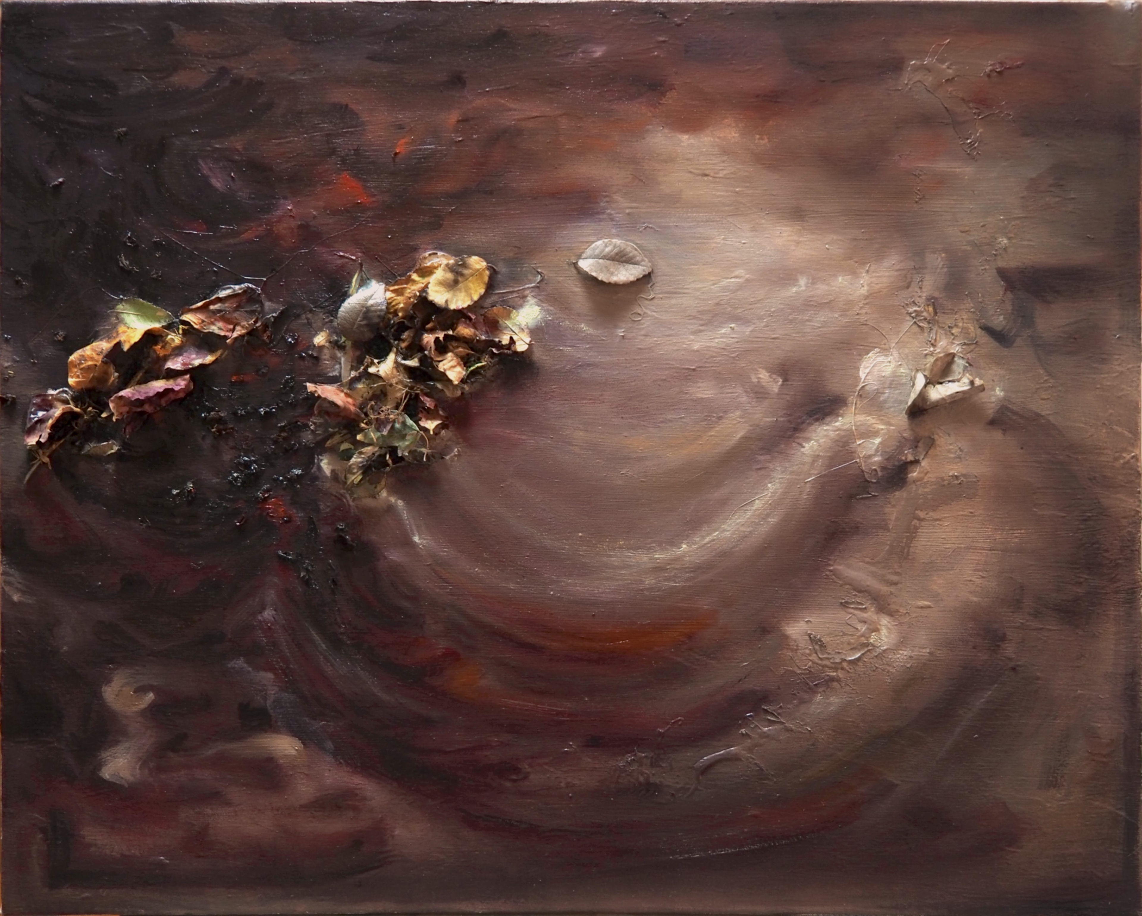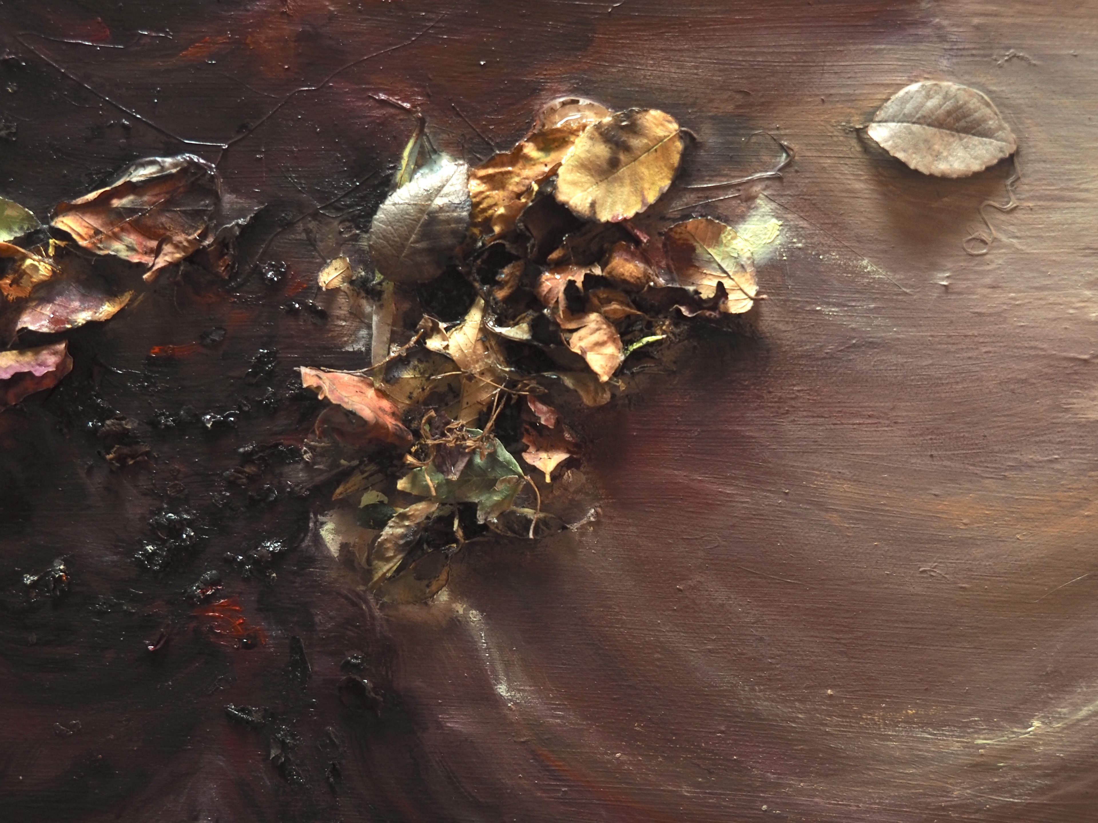 Ashes, burnt dried leaves, resin, and oil on canvas