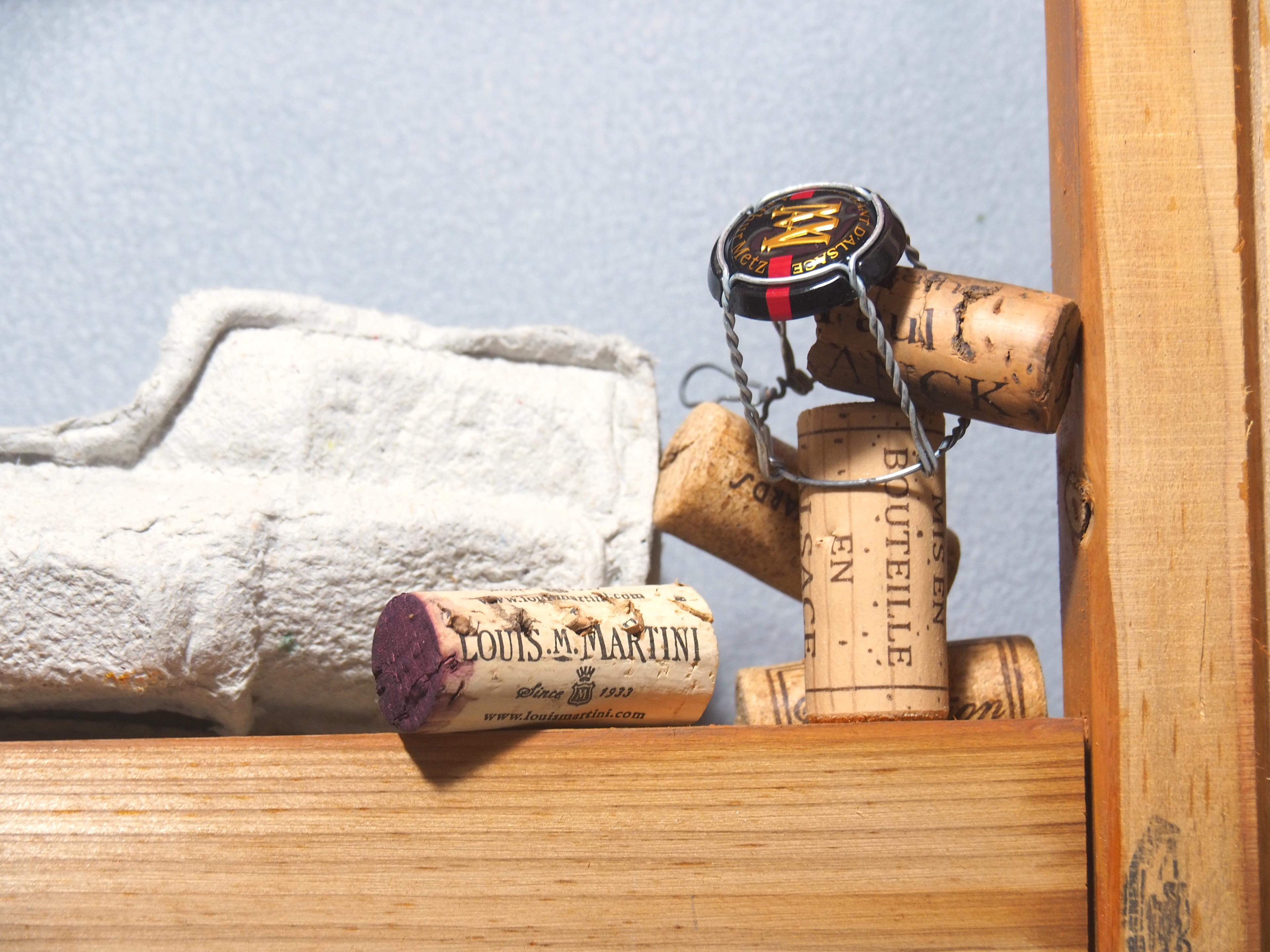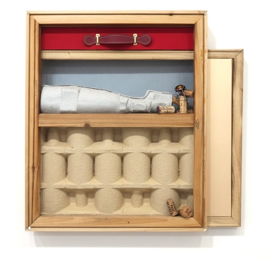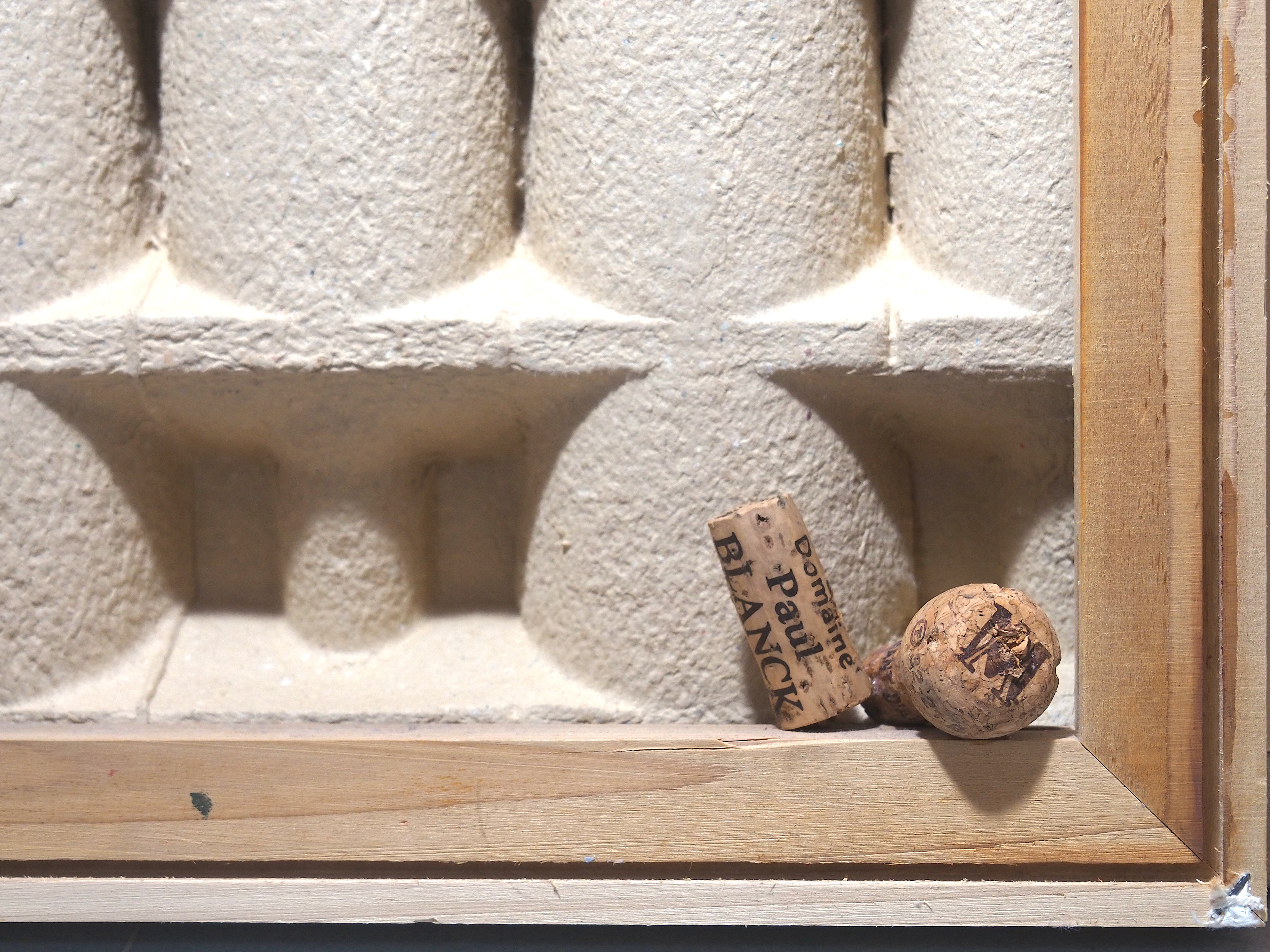 Canvas frames, chopped paper box, wine corks, moulded pulp wine bottle 60 × 60 × 11 cm